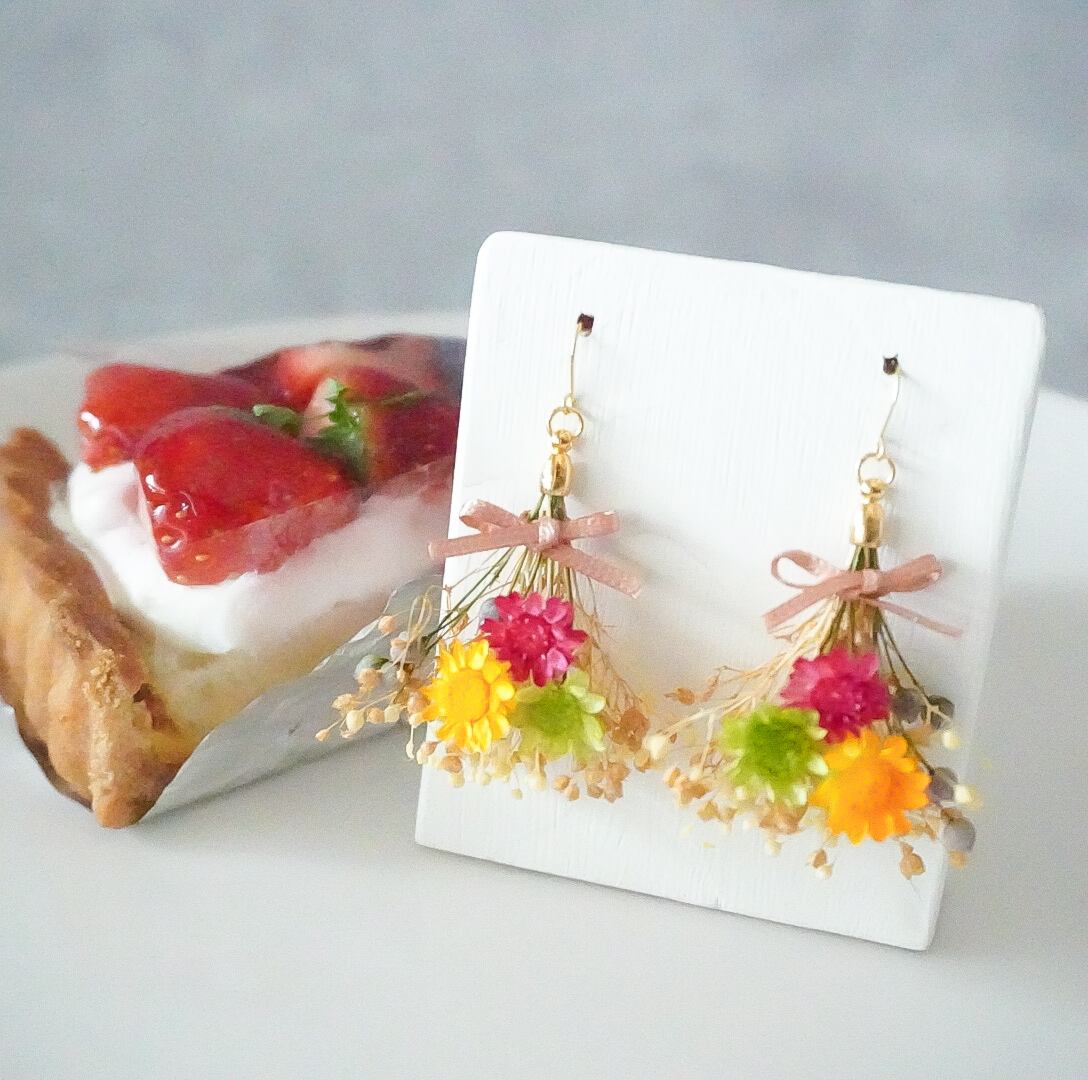 宝石が煌めくような色とりどりのフルーツタルトをイメージした花束。